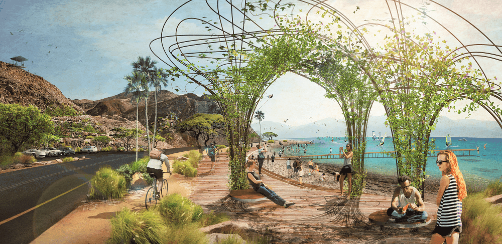 לצד פיתוח טיילת השלום מטאבה לעקבה שתכלול מוקדי פעילות ואירוח איכותיים ומגוונים, תחולק רצועת החוף לשני מתחמי תיירות משלימים: בצפון, התחדשות עיר החוף כמרחב תיירותי תוסס ושוקק חיים בסטנדרטים הגבוהים ביותר ובדרום יפותח החוף כמתחם תיירות טבע ייחודי ״עין סוף אילת״ המציע רוגע בחיק הנוף המרהיב של אילת, כולל מתחם תיירותי אקולוגי הקושר בין הים למדבר תוך שמירה על ערכי הטבע, הכשרת נאות מדבר מוצללות, מזחים ייחודיים, כפרי גולשים, צוללים ומטיילים, בניית מלונות נישה ומתחמי אירוח ייחודיים המשולבים במקום ובנוף.